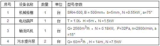 格柵間和污水提升泵房聯(lián)建,室內設置機械格柵1臺。格柵間尺寸為7.5m×4.5m×6.0m ,磚混結構。主要設備如下表。