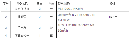 設計調節(jié)池1座,水力停留時間22h ,尺寸為25m×10m×6.0m ,有效水深5.5m ,鋼混結構。池內主要設備如下表。