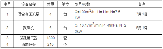 設計A /O 池二座,尺寸為39.0m ×18.0m×6m ,在長度方向上分為4個串聯(lián)的廊道,每個廊道寬5m ,有效水深為5m 。前兩個廊道為A 段,每段設置潛水推進器一臺,并設置微孔曝氣器以增強對廢水的攪拌,防止大量污泥沉積。后兩個廊道為O 段,通過鼓風機和微孔曝氣器向池內供氧。A 段主要設備:潛水推進器:4臺;微孔曝氣器1000個。O 池采用鼓風微孔曝氣。為抑制曝氣池中泡沫的產生,沿曝氣池隔墻表面布設有消泡水管。O 段主要設備如下表。