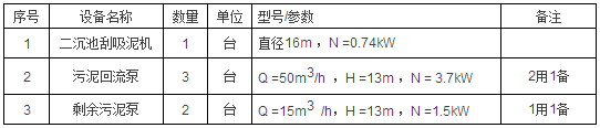 中心進水的輻流式沉淀池一座,二沉池直徑16m ,總高4.4m ,超高0.5m ,鋼筋混凝土結構。內設刮吸泥機1臺,功率1.87kW 。二沉池的底泥通過刮吸泥機進入集泥井,集泥井尺寸為4.5m×3.0m×5.9m。主要設備如下表。