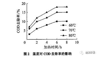 2.1加熱破乳:移取廢乳化液150 mL置于250 mL錐形瓶中,直接水浴加熱60。C、70℃、80℃,分別加熱0.5,2,4,6,8 h,然后靜置I h冷卻后取錐形瓶底部溶液10mL,稀釋50倍測定數(shù)據(jù),觀察破乳效果,試驗結果如圖1、圖2所示。