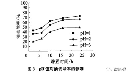 從圖3和圖4可以看出,加酸破乳比加熱破乳效果更明顯,油的去除率最高可以達到73%,COD的去除率可以達到64%。試驗過程中加入硫酸調整pH值,加入酸后震蕩1 min,水面明顯出現(xiàn)一層油,但是比單純加熱產生的浮油顏色淺,呈黃色,這說明加酸后破壞了乳化液,形成了有機酸而使油水分離。而且pH值越低,產生的浮油量越多,浮油出現(xiàn)的速度也越快。隨著靜置時間的增加,pH值越低錐形瓶內乳化液分層越明顯。靜置10 h以上,pH值為1、2的錐形瓶底部出現(xiàn)一層透明的清液,中間大部分是混濁的乳白色,上部一層黃色浮油,pH=3的錐形瓶底部沒有明顯的透明清液。建議酸化破乳pH值控制在1—2。