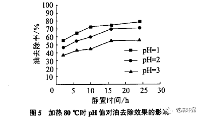 從加熱試驗效果和加熱能耗兩個方面考慮,本次試驗選擇加熱至80℃和加熱4 h來進行破乳效果的觀察。從圖5和圖6的數(shù)據(jù)曲線對比圖3和圖4數(shù)據(jù)曲線可以看出,相同pH值條件下,加熱可以加速初期破乳,加熱后靜置2,6,10 h后破乳效果明顯優(yōu)于同pH值下不加熱破乳效果。但是靜置時間超過16 h以上后,相同pH值條件下,破乳效果同不加熱相比增加不多。