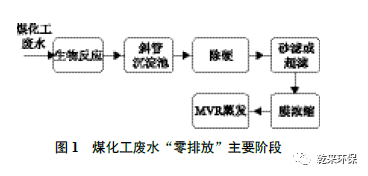 隨著環(huán)保政策的收緊,國家對(duì)已建和新建的煤化工項(xiàng)目要求廢水“零排放”。雖然不同煤化工工藝產(chǎn)生的廢水性質(zhì)有所差異,但傳統(tǒng)處理煤化工廢水的工藝大多包括生物活性處理、化學(xué)沉淀、懸浮物過濾、膜濃縮產(chǎn)水回用和蒸發(fā)固化等。圖1 為煤化工廢水“零排放”主要階段示意。