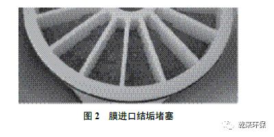 為減少蒸發(fā)量,部分廠家采用RO 膜技術(shù)進(jìn)行濃縮。煤化工廢水TDS濃度約為3 000 mg ˙ L-1,硬度約為300 mg ˙ L-1,COD 約為300 mg ˙L-1。在高濃縮比的工況下,長時(shí)間運(yùn)行會(huì)對(duì)膜進(jìn)口和膜面產(chǎn)生污染。因此需投加藥劑除硬,增加了污泥外置費(fèi)用。卷式RO 膜無法進(jìn)一步提高濃縮比的主要原因有兩個(gè):第一是卷式RO 膜的進(jìn)入通道較窄,第二是其膜面剪切力不足。RO 膜進(jìn)口結(jié)垢堵塞情況見圖2。