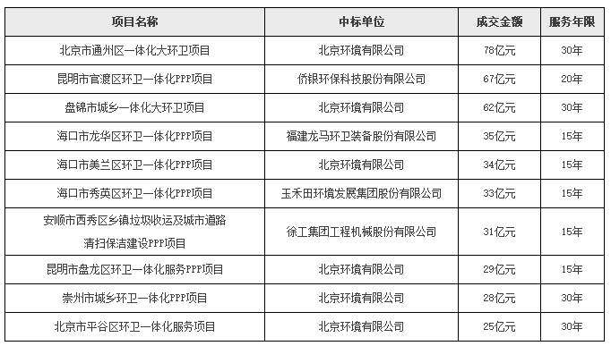 環(huán)衛(wèi)一體化25億元以上項(xiàng)目匯總表
