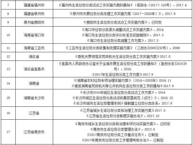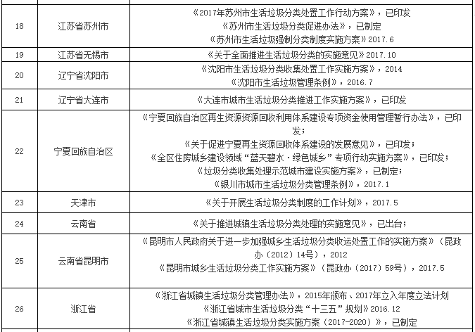 附:地方生活垃圾分類政策一覽