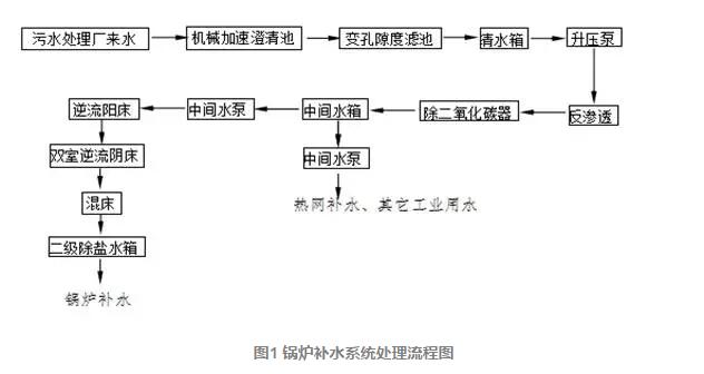 侯馬市水資源短缺,根據(jù)國家“禁用地下水、慎用地表水、鼓勵用中水”的環(huán)保政策,我公司在設計中本著盡量減少新鮮水用量的原則,在工業(yè)用水設計中采用了一水多用、按質使用、逐步降級使用的方案,利用城市污水處理廠的城市中水,經(jīng)過一系列深度處理后,作為本機組發(fā)電運行的鍋爐補給水、熱網(wǎng)補水、輔機冷卻水及其它工業(yè)用水水源,將澮河二庫地表水作為電廠生產(chǎn)用水應急備用水源。廠內(nèi)配套建設了給排水、中水深度處理回用系統(tǒng)。根據(jù)城市污水廠出水水質,鍋爐補水處理系統(tǒng)采用以下方案,前段出水可用于熱網(wǎng)補水及其它工業(yè)用水,流程見下圖。