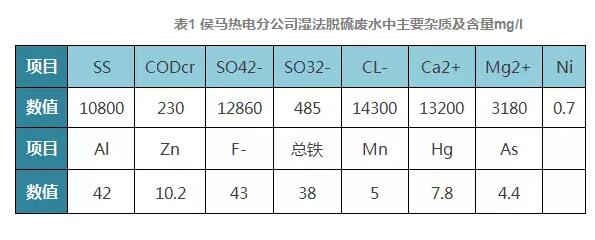 3.4 脫硫廢水:煙氣濕法脫硫過程產(chǎn)生的廢水來源于吸收塔排放水。為維持脫硫裝置將夜循環(huán)系統(tǒng)的物質的平衡,需要定時從吸收塔排除廢水。我公司脫硫廢水中主要雜質及其含量,PH值為6.7,其中有些物質為國家環(huán)保標準要求嚴格控制的第一類污染物。具體指標見下表。