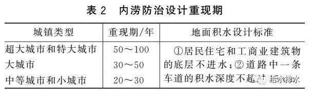 《Urban Storm Drainage Criteria Manual》對于內澇防治設計重現(xiàn)期時的道路積水有詳細規(guī)定,我國《室外排水設計規(guī)范》有類似規(guī)定,見表2。