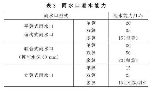 國家標準圖集《雨水口》(16S518)提供了一個在一定水力條件下(道路縱坡0.3%~3.5%,橫坡1.5%,箅前水深40 mm)通過1∶1的水工模型經過試驗確定的不同型式雨水口泄水能力,如表3所示。