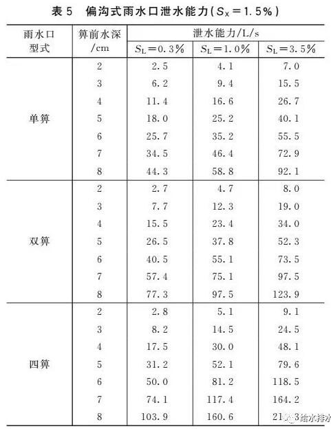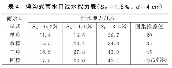 (1)雨水口泄水能力不應超過其偏溝流量,而我國標準圖集泄水能力推薦值卻超過了偏溝流量。對于箅前水深、道路橫坡和縱坡一定的偏溝式雨水口,其偏溝流量是固定的(見表6)。對于箅前水深4 cm的偏溝式雨水口,偏溝式雨水口泄水能力不應大于18.2 L/s(SL=0.3%)、33.1 L/s(SL=1.0%)、62.0 L/s(SL=3.5%),這和箅子數(shù)量無關。