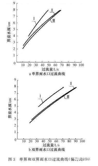 當箅前水深大于40 mm時,圖集還提供了雨水口過流曲線圖供設計人員查找,見圖3。圖中Ⅰ、Ⅱ、Ⅲ型分別為道路縱坡0.3%、1.0%和3.5%。