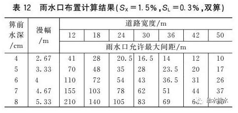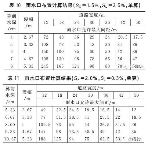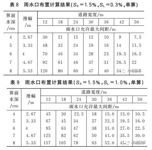 (5)如果以表1中允許漫幅作為雨水口布置的依據(jù),那么《室外排水設計規(guī)范》推薦的雨水口允許最大間距(25~50 m)均可以滿足要求。例如,對于縱坡0.3%和橫坡1.5%的50 m寬道路,當雙側間隔28.5 m布置單箅雨水口時,其箅前水深為8 cm,漫幅為5.33 m,此時立緣石未淹沒(立緣石外露高度為10~20 cm),且未淹沒2條車道(至少6.5 m寬)。