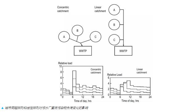 Gujer教授提醒我們污水處理系統(tǒng)除了污水處理廠(chǎng)之外,管網(wǎng)也是其重要的組成。污水廠(chǎng)的進(jìn)水負(fù)荷變化在某程度是由于污染物進(jìn)入管網(wǎng)時(shí)間的差異,以及管網(wǎng)分布的長(zhǎng)度造成的,這兩個(gè)因素都跟時(shí)間這個(gè)變量有關(guān)。Gujer教授用下圖闡述了同軸排列和線(xiàn)性排列兩種排放模式的區(qū)別——前者的負(fù)荷變化更大,而后者的收集方式能使進(jìn)水水質(zhì)更穩(wěn)定。由于晝夜負(fù)荷變化很大程度上控制了生物處理過(guò)程中的硝化性能,所以使用后者的城市規(guī)劃模式對(duì)該地區(qū)的污水處理是有好處的。