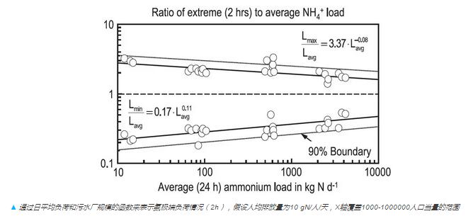 下圖總結(jié)了不同污水收集方式下氨的極端負(fù)荷和日平均負(fù)荷的比值。由于硝化處理設(shè)計(jì)的安全系數(shù)通常按照最大負(fù)荷和平均負(fù)荷的比值來(lái)設(shè)定,因此該圖能提供重要的設(shè)計(jì)信息。根據(jù)此圖,我們會(huì)發(fā)現(xiàn)安全系數(shù)的選定是個(gè)很有趣的事情——安全系數(shù)(也就是相應(yīng)的SRT)設(shè)定越大,污水廠(chǎng)的處理能力就變小,因此專(zhuān)業(yè)性就降低,而且更加難以運(yùn)行。