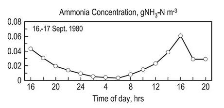 又如下圖所示,在距離某部分硝化的污水廠(chǎng)出水口1.5km的某河里的氨氮濃度晝夜差異。溫度、pH和氨氮負(fù)荷受到陽(yáng)光的同步作用導(dǎo)致了這里的有毒物質(zhì)濃度的極端變化。