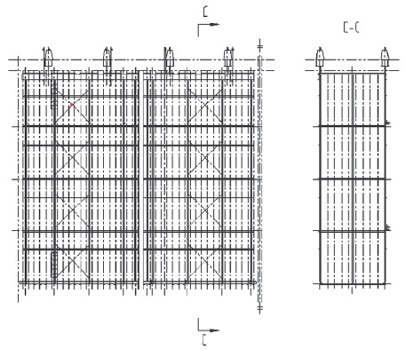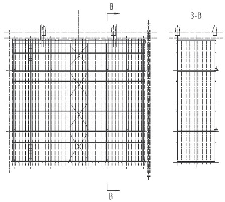 對圖1中的A一A剖視,電除塵器內(nèi)部第一電場的陰極系統(tǒng)如圖2所示,對其進行小分區(qū)改造后如圖3所示。將原陰極系統(tǒng)框架中間位置割開,原一個陰極大框架被分為兩個小框架;移動原陰極吊掛,并每個電場增加兩個陰極吊掛,使兩個陰極小框架獨立供電;割除原框架拉桿,在新的小框架中間各增加一排框架拉桿;在大框架割斷附近兩端,增加豎桿,以增大小框架兩端的強度。
