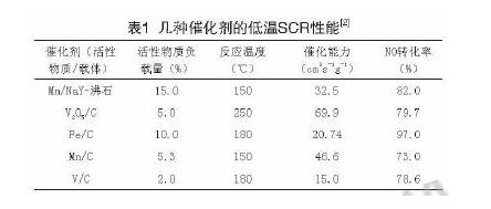 (2)SCR催化劑原材料表面改性技術和配方。即調(diào)整催化劑表面酸堿性,以獲得更多的酸性活性基團,增強對還原劑NH的吸附,或在高效的載體上配合不同的活性物質(zhì),如V、W、Mn、Cu、Ni~lPt等金屬氧化物,使催化劑具有高的抗SO,和水蒸氣活性。表1列舉了使用不同載體以及表面陽離子修飾技術制備的不同催化劑在較低溫度下(150cC~250cC)的脫硝活性。