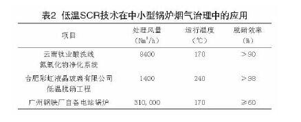 低溫SCR催化脫硝技術的應用是一項非常復雜的工程,面臨著眾多應用領域。表2列舉了我國低溫SCR技術在酸洗行業(yè)、玻璃窯爐和鋼鐵鍋爐煙氣治理中的應用。