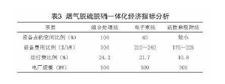 現(xiàn)在已經(jīng)付諸商業(yè)應用的且能夠滿足嚴格的排放要求的煙氣脫硫、脫硝一體化工藝主要有電子束法和活性焦法。表3是這2種方法以及石灰石一石膏濕法脫硫+SCR脫硝(簡稱組合法)的主要經(jīng)濟技術指標的分析結果對比。