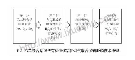 目前研究較多的催化劑為Fe、Mn等過渡金屬離子和乙二胺合鈷等有機物。以乙二胺合鈷為例說明濕法有機催化氧化煙氣聯(lián)合脫硫脫硝技術原理,如圖2所示。