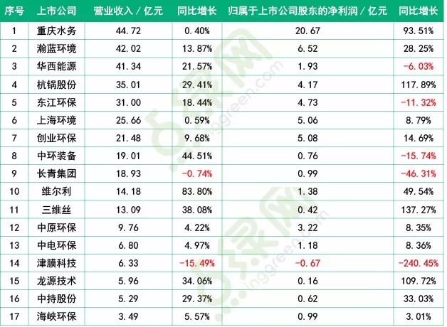 截止4月3日止共有17家環(huán)保上市公司發(fā)布2017年年報(其余將繼續(xù)跟進)。2017年營收排名靠前重慶水務(wù)、瀚藍(lán)環(huán)境、華西能源均在40億以上,營收僅津膜科技和長青集團同比下降。
