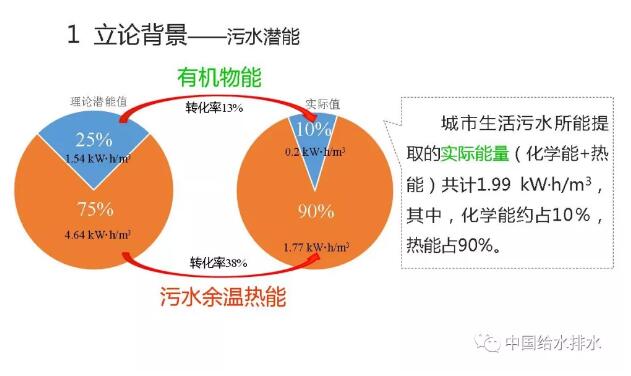 今天我的發(fā)言既與碳中和有關(guān)也跟磷回收有關(guān)。那么,關(guān)于碳中和談得是污水處理的耗能過程,有機物及氮磷去除要消耗能量,碳中和即需要從污水處理廠或污水里找到能量去彌補能耗。對此,大家更多會想到剩余污泥里有大量含能有機物,這也是我們搞污水處理人所關(guān)注的,所以,污泥厭氧消化從傳統(tǒng)到現(xiàn)在,以至于有更多的人前赴后繼對厭氧消化進行優(yōu)化提高其能量轉(zhuǎn)化效率,包括前處理,比如說,高碑店現(xiàn)在的熱水解,就是希望最大化把污泥中的有機能源轉(zhuǎn)化出來。但是,我們搞污水處理的人忽視了一個問題,就是說除了有機物形成的化學(xué)能以外,還有大量污水中的余溫?zé)崮堋U埓蠹铱催@個圖,有機物中的化學(xué)能與污水中余溫?zé)崮芟啾?,很少、很少。理論上一個75%,一個25%。也就是說污泥中有機物的化學(xué)能只占整個污水中潛能的25%,75%是熱能。我們給大家先看這樣一個概念,也就是說我們所關(guān)注的厭氧消化轉(zhuǎn)化的能源占整個污水中的潛能,理論值是25%。那么這25%的有機能源又能轉(zhuǎn)化多少呢?顯然這是個理論值,不可能100%轉(zhuǎn)化。