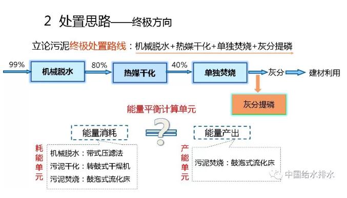 因此,最后只有去“燒”!但是,“燒”必須要經(jīng)過機械脫水,含水率99%的污泥首先降至80%;然后,再熱干化到40%以下。到40%就可以自持燃燒了。燒,但污泥焚燒千萬不能放在水泥窯中同水泥一塊燒。這樣不對。會把磷就全部固定在水泥里,磷再也不能回用了!所以,要單獨燒。最多可以跟有機垃圾一塊燒。燒完以后,大量的磷都在灰分里面,需要提取。當(dāng)然了,大家知道,脫水、熱干化、單獨焚燒都是要輸入能量的,當(dāng)焚燒之后也會產(chǎn)生能量?,F(xiàn)在我們有一個問題,就是輸入能量和產(chǎn)生的能量能否達到平衡?我們需要計算一下,如果能打個平手那就是很了不起的事了。