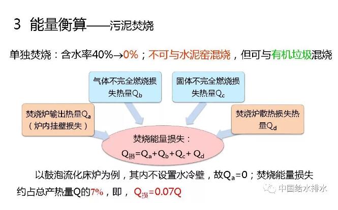 單獨焚燒,含水率40%~0%。不可與水泥窯混燒,但可與有機垃圾混燒。焚燒有熱量損失,焚燒爐輸出的熱量,比如說爐內(nèi)壁掛損失、焚燒爐散熱損失等等,所有損失加在一起,以鼓泡流化床為例,大概就是7%,即占焚燒產(chǎn)生熱量的7%,這都是有文獻可查的。污泥焚燒也產(chǎn)生熱量,這個熱量主要跟有機質(zhì)有關(guān),這個是計算公式。我們國家有機質(zhì)含量比較低,在30%~60%的范圍,我們計算時取污泥有機質(zhì)含量中間值53%,北京大概是60%。計算污泥燃燒熱為1.2GJ/kgDS。這是不同國家污泥燃燒值,中國大概在個范圍,平均是11850kJ/kgDS。我們的計算跟這個1.185GJ/kgDS基本接近,這都是從文獻來的數(shù)據(jù)。這樣經(jīng)過計算以后,污泥脫水+干化+焚燒,脫水要輸入能量,干化要輸入能量,焚燒產(chǎn)生能量;最后的結(jié)果會發(fā)現(xiàn)總耗能是3091度電每噸干固體??偖a(chǎn)能11.1GJ,利用熱電聯(lián)產(chǎn)轉(zhuǎn)換為電當(dāng)量為2467度電。也就是說整個工藝的能量輸入為624度電。下面是詳細的計算表,不講了。