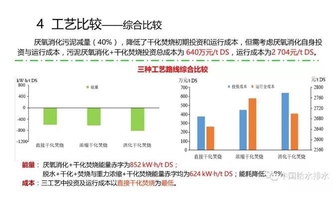 我們倡導(dǎo)、推薦的污泥處置路線是機械脫水+熱媒干化+單獨焚燒。這個總的輸入能量和產(chǎn)出能量有略微的差異,差在哪呢?你要輸入624度電。也就是說有624度電的赤字,而厭氧消化+干化焚燒是852度電。大家沒想到吧!都說厭氧消化以后應(yīng)該產(chǎn)能啊,它怎么耗能更大呢?因為厭氧消化產(chǎn)能,它本身也需要耗能,再者,污泥消化產(chǎn)能后,焚燒熱能便低了。我說的厭氧消化還沒有算熱水解能耗和投資,如果加上熱水解則會更大。大家沒有想到吧,在我講之前很多人都認為這個厭氧消化應(yīng)該是凈能耗較少。實際上不是的,它是個耗能過程。