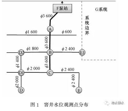 試驗(yàn)開(kāi)始前,對(duì)F調(diào)蓄池實(shí)施徹底清淤。每次試驗(yàn)時(shí),一般每隔24 h開(kāi)啟調(diào)蓄池,調(diào)蓄池蓄滿(mǎn)時(shí)間均在15 min左右。設(shè)計(jì)試驗(yàn)時(shí),在F泵站進(jìn)水總管、F系統(tǒng)邊界處,設(shè)置8個(gè)窨井水位觀(guān)測(cè)點(diǎn),分別為:位于總管上的A、B、C 3個(gè)點(diǎn);和B點(diǎn)直接相通的D2點(diǎn)、和B點(diǎn)直接相通且位于系統(tǒng)邊界處的E1點(diǎn);相對(duì)位于遠(yuǎn)端的、類(lèi)似于進(jìn)水管“肩膀”處的D、E、D1等3個(gè)點(diǎn),詳見(jiàn)圖1。