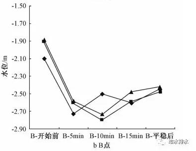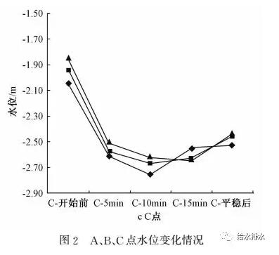 試驗(yàn)發(fā)現(xiàn),A、B、C、D2、E1等5個(gè)點(diǎn)的水位,會(huì)隨F調(diào)蓄池進(jìn)水至蓄滿(mǎn)而呈U型狀變化,以A、B、C為例(見(jiàn)圖2),基本都在10~15 min時(shí)水位變化最為明顯。但位于遠(yuǎn)端的D、E、D1等3個(gè)點(diǎn)幾乎未發(fā)生變化。由此可以初步判斷,F(xiàn)調(diào)蓄池對(duì)進(jìn)水總管的拉動(dòng),至C點(diǎn)結(jié)束,總長(zhǎng)約1 200 m;調(diào)蓄池的運(yùn)行,僅對(duì)鄰近的管網(wǎng)起到了收水效果。