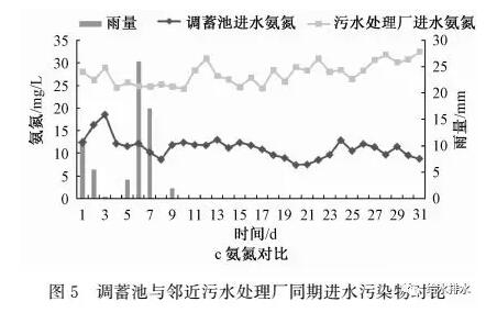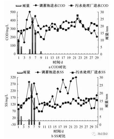 汛后試驗(yàn)的水質(zhì)監(jiān)測(cè)對(duì)象是調(diào)蓄池進(jìn)水,將其與同期污水處理廠(chǎng)進(jìn)水水質(zhì)比較,結(jié)果見(jiàn)圖5。