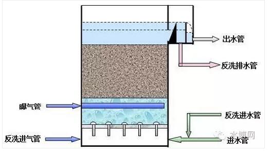 隨著過濾的進行,由于濾料表面新產生的生物量越來越多,截留的SS不斷增加,在開始階段濾池水頭損失增加緩慢,當固體物質積累達到一定程度,使水頭損失達到極限水頭損失或導致SS發(fā)生穿透,此時就必須對濾池進行反沖洗,以除去濾床內過量的微生物膜及SS,恢復其處理能力。