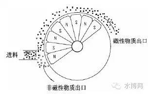 含有磁粉和污泥的污水從轉(zhuǎn)鼓的一端進(jìn)入分離裝置,固定磁極將磁性顆粒吸出并附著在滾筒表面,隨著滾筒的轉(zhuǎn)動(dòng),被帶至磁系邊緣的低磁區(qū),并從磁性物質(zhì)出口卸下,非磁性物質(zhì)則在重力的作用下,沿分離槽流至非磁性物質(zhì)出口排出,完成磁性物質(zhì)和非磁性物質(zhì)的分離過(guò)程。