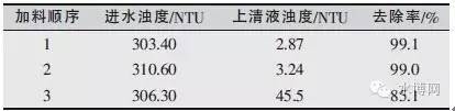 保持其他工況不變分別試驗(yàn)以下3種加料順序?qū)Υ判跄磻?yīng)的影響。①先加PAC,再加入磁粉,然后加PAM;②同時(shí)加入磁粉和PAC,然后加PAM;③先加PAC,再加PAM,最后加磁粉。其中每種物料的投加間隔時(shí)間為2min。針對(duì)以上3種加料順序分別測(cè)試上清液的濁度,結(jié)果列于表2。