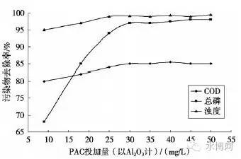 保持其他參數(shù)不變,將PAM投加質(zhì)量濃度恒定,調(diào)節(jié)PAC的投加量(以Al2O3計(jì)),分別測(cè)試各種加藥量下的COD、總磷及濁度指標(biāo),并計(jì)算出各項(xiàng)污染物的去除率,將試驗(yàn)結(jié)果繪于圖3中。