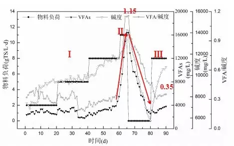 對于反應(yīng)器運(yùn)行過程中堿度和有機(jī)酸濃度的變化,VFA/堿度基本在0.4以內(nèi),表明反應(yīng)器運(yùn)行較為穩(wěn)定,VFAs、堿度和VFA/堿度均急劇上升。