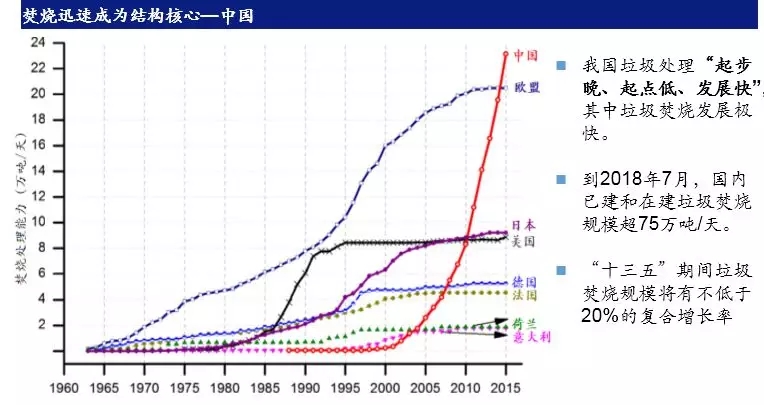 接著分別介紹了全球不同區(qū)域的垃圾處理狀況,分析了歐州、英國、美國、日本等國家的垃圾處理能力,總結(jié)了國際垃圾處理的發(fā)展形勢:英國垃圾焚燒成為歐洲最大的新興市場;日本不同類型焚燒設(shè)施總數(shù)減少但大廠增加,總處理量基本穩(wěn)定,發(fā)展相對成熟;美國近年來處于停滯狀態(tài);中國的垃圾處理發(fā)展正在進(jìn)入全速發(fā)展階段。