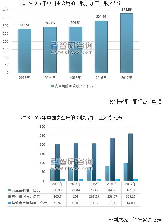 近兩年,在我國(guó)廢舊回收體系不斷完善的基礎(chǔ)上,我國(guó)貴金屬回收產(chǎn)業(yè)不斷發(fā)展,回收量和回收及加工企業(yè)的收入也在不斷的增長(zhǎng)中,2016年我國(guó)再生金的產(chǎn)量達(dá)到了37.5噸,2017年增長(zhǎng)至40.2噸,同時(shí)再生金占我國(guó)黃金總產(chǎn)量的比例不斷提升,中國(guó)黃金協(xié)會(huì)的統(tǒng)計(jì)數(shù)據(jù)顯示,2016年和2017年我國(guó)黃金產(chǎn)量總量分別為453.5噸和426.1噸,再生金產(chǎn)量占比分別為8.27%和9.43%,同時(shí)相關(guān)企業(yè)的再生金銷售收入也從84.38億元增長(zhǎng)至101.30億元。而再生銀依然是我國(guó)回收量最大的貴金屬,2016年達(dá)到6265噸,2017年增長(zhǎng)至6265噸,相應(yīng)的收入分別為238.07億元和263.17億元。