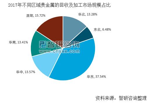 目前,國(guó)內(nèi)貴金屬的回收及加工需求市場(chǎng)主要集中在人口密集、經(jīng)濟(jì)發(fā)達(dá)的地區(qū)以及服務(wù)水平較高的各省一二線城市,存在一定的區(qū)域性特征。其中,華東地區(qū)市場(chǎng)需求最大,占全國(guó)比重達(dá)到37.54%。其次是華中、華南和華北地區(qū),總的來看,這幾個(gè)地區(qū)基礎(chǔ)工業(yè)發(fā)展較為完善,含廢舊貴金屬的產(chǎn)品消費(fèi)量大,廢舊貴金屬產(chǎn)業(yè)具有較大的想象空間。但是從整個(gè)產(chǎn)業(yè)的發(fā)展完善的程度來看,北京地區(qū)已經(jīng)基本形成了完善的回收加工體系,上海地區(qū)的緊隨其后,華東和華南的部分區(qū)域依然以小作坊為主,產(chǎn)業(yè)發(fā)展環(huán)境急需規(guī)范。