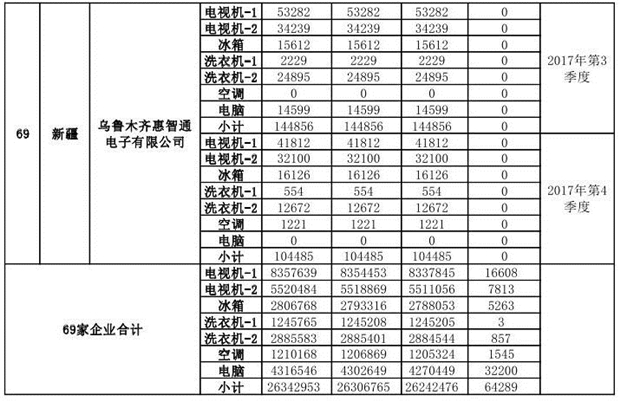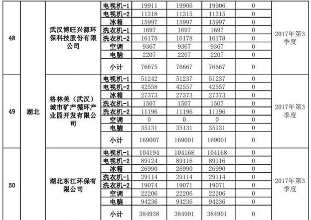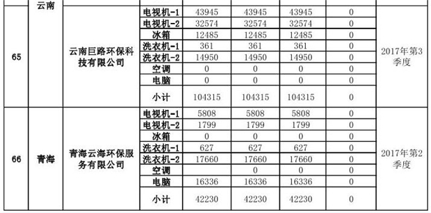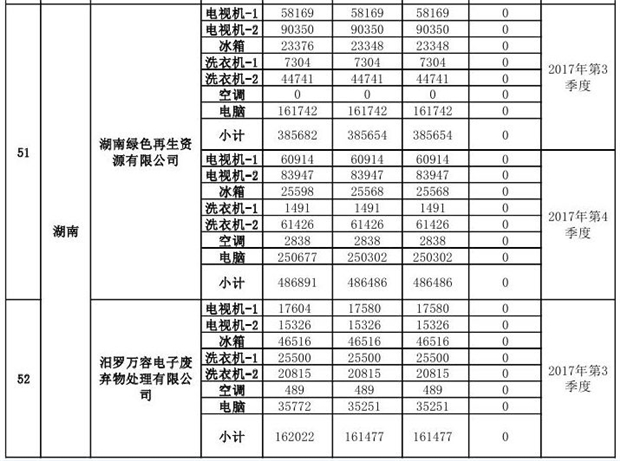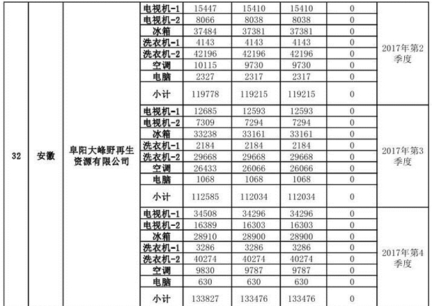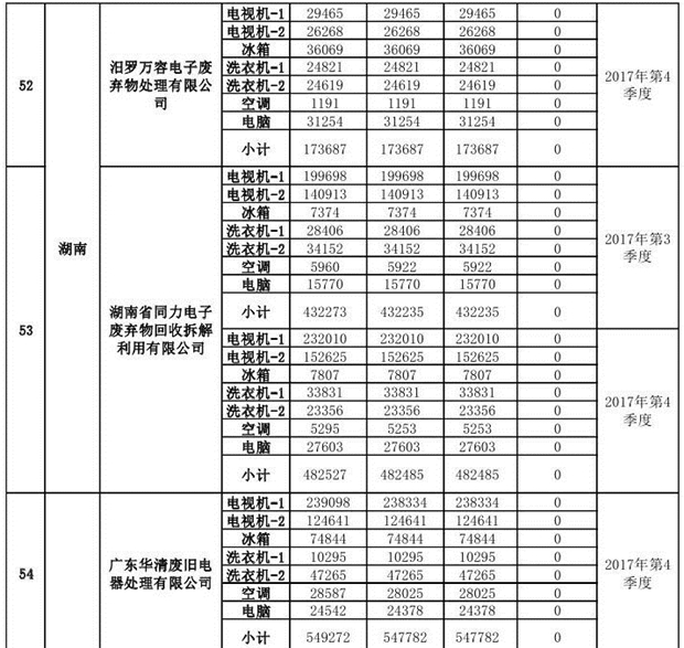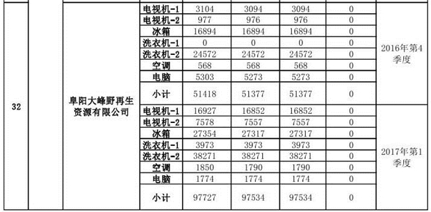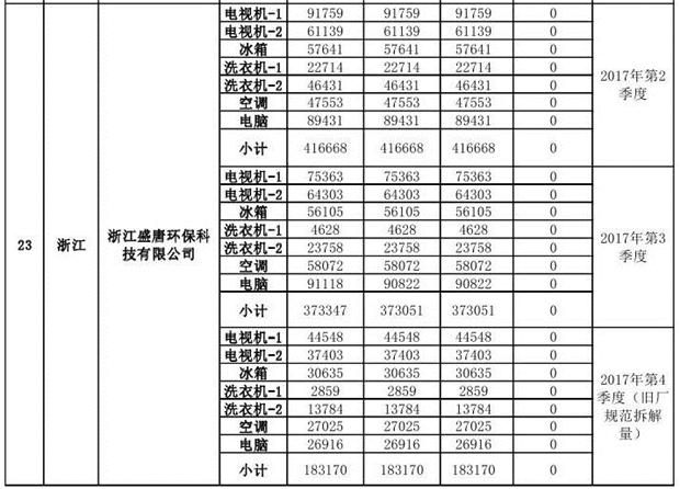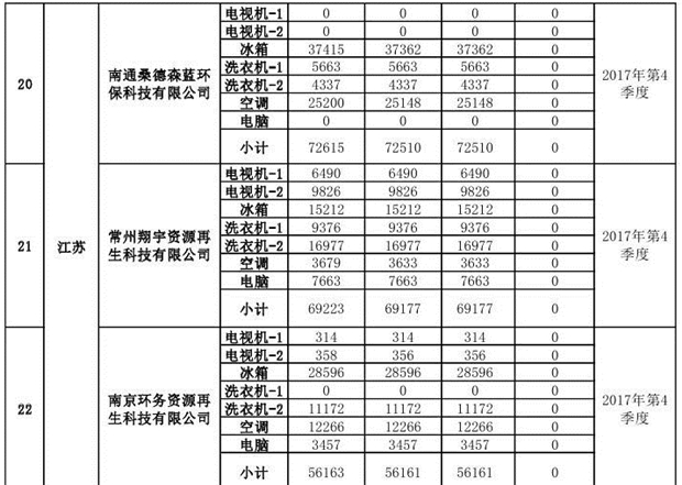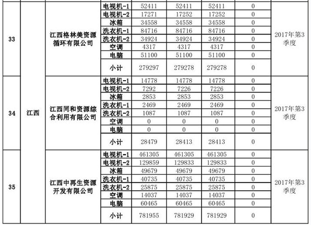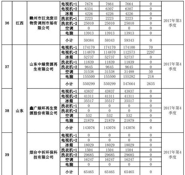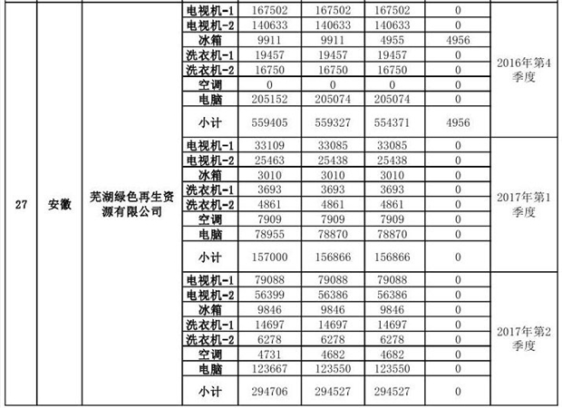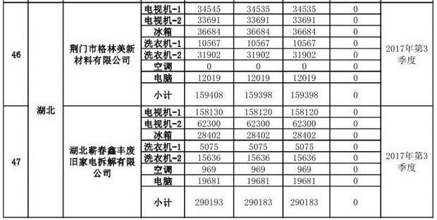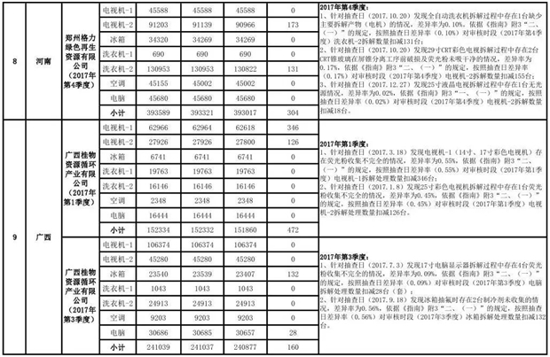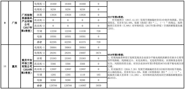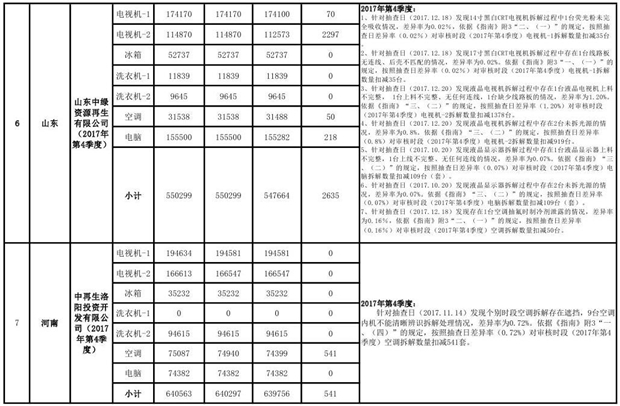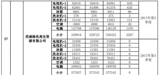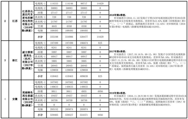 上述69家通過技術(shù)復(fù)核的企業(yè)申請廢電器規(guī)范拆解處理數(shù)量為26342953 臺(tái)(套);經(jīng)省級環(huán)保部門審核認(rèn)定廢電器規(guī)范拆解處理數(shù)量為26306765臺(tái)(套),扣減36188臺(tái)(套);部固管中心通過技術(shù)復(fù)核擬確認(rèn)廢電器規(guī)范拆解處理數(shù)量為26242476臺(tái)(套),扣減64289臺(tái)(套)(詳見附件)。