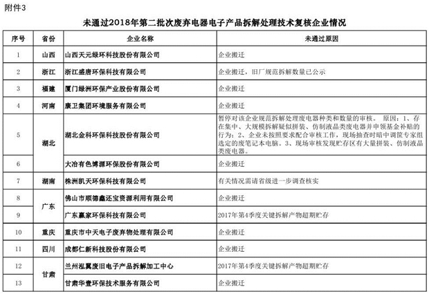 附件3:《未通過2018年第二批次廢棄電器電子產(chǎn)品拆解處理技術(shù)復(fù)核企業(yè)情況公示表》