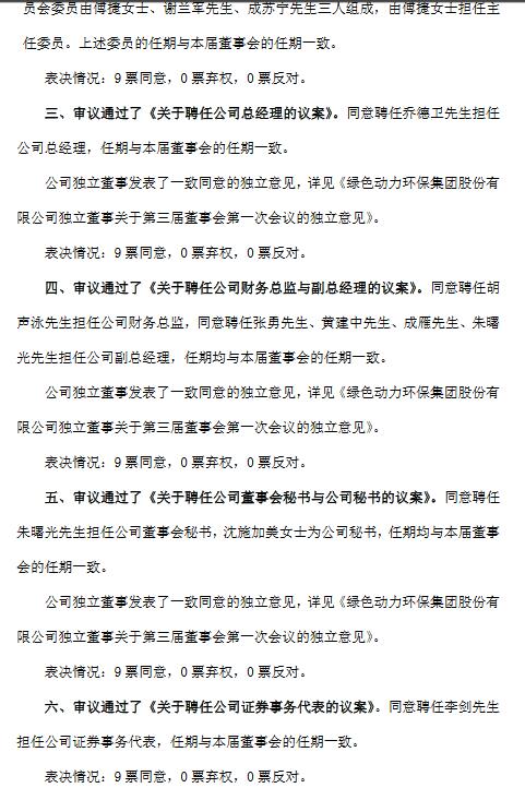 綠色動(dòng)力環(huán)保發(fā)布公告,公司董事會(huì)審議通過(guò)了《關(guān)于選舉公司第三屆董事會(huì)董事長(zhǎng)的議案》。選舉董事直軍擔(dān)任公司第三屆董事會(huì)董事長(zhǎng);審議通過(guò)了《關(guān)于聘任公司總經(jīng)理的議案》。同意聘任喬德衛(wèi)擔(dān)任公司總經(jīng)理;審議通過(guò)了《關(guān)于聘任公司財(cái)務(wù)總監(jiān)與副總經(jīng)理的議案》。同意聘任胡聲泳擔(dān)任公司財(cái)務(wù)總監(jiān),同意聘任張勇、黃建中、成雁、朱曙光擔(dān)任公司副總經(jīng)理。