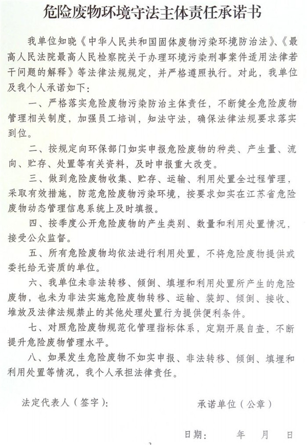 按照江蘇省環(huán)保廳的要求,每個危險廢物產(chǎn)生單位和經(jīng)營單位都要簽署“危險廢物環(huán)境守法主體責(zé)任承諾書”,一式二份,一份交屬地環(huán)保局,一份自留。