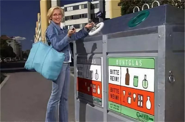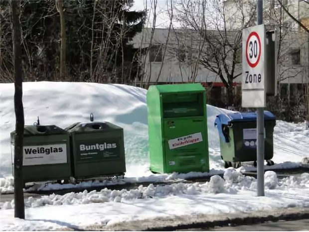 玻璃制品回收箱 :廢玻璃通過(guò)玻璃回收箱(Glascontainer)進(jìn)行回收。同時(shí)有白色玻璃、雜色玻璃之分。有兩點(diǎn)事項(xiàng)需要注意:第一,請(qǐng)勿將帶有押金的包裝瓶(Pfandflaschen)丟入回收桶中;第二,玻璃瓶在丟棄前要去除瓶蓋,因?yàn)槠可w屬于黃桶廢棄物。