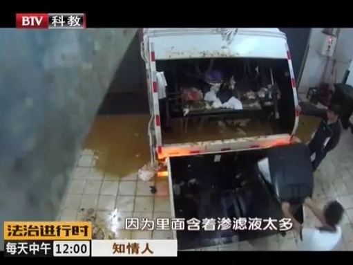 由于混裝,他們的第一道工序是將餐廚垃圾倒進(jìn)車?yán)铩=?jīng)過擠壓。餐廚中的液體灑落一地,畫面略引起不適。