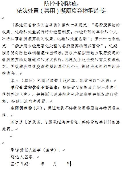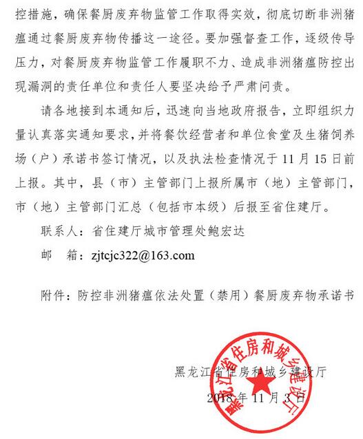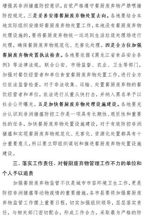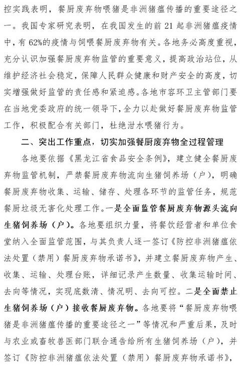 日前,黑龍江住建廳發(fā)布了關(guān)于防控非洲豬瘟加強(qiáng)餐廚廢棄物管理工作的緊急通知,《通知》指出,目前,全國和我省非洲豬瘟防控工作形勢十分嚴(yán)峻。國際非洲豬瘟防控實(shí)踐表明,餐廚廢棄物喂豬是非洲豬瘟傳播的重要途徑之一。各地要杜絕泔水喂豬,依據(jù)《黑龍江省食品安全條例》,建立健全餐廚廢棄物監(jiān)管機(jī)制,將餐飲經(jīng)營者和單位食堂納入全面監(jiān)管范圍,與其負(fù)責(zé)人逐一簽訂承諾書,并建立餐廚廢棄物產(chǎn)生、收集、運(yùn)輸、處理臺賬,實(shí)現(xiàn)底數(shù)清、情況明、去向可控。全面禁止生豬飼養(yǎng)場(戶)接收餐廚廢棄物。