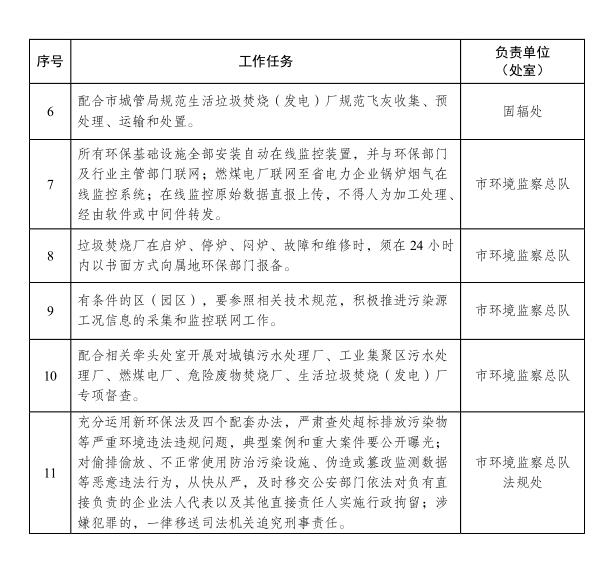 危險廢物焚燒廠嚴格落實危險廢物申報登記、貯存管理、轉(zhuǎn)移聯(lián)單、應急預案等許可條件要求,設施工況運行滿足要求,污染處理設施運行正常,廢水、廢氣排放達到《危險廢物焚燒污染控制標準》,次生危險廢物實現(xiàn)安全處置。(市環(huán)保局牽頭,相關(guān)區(qū)、園區(qū)負責落實)